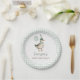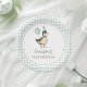 Con un delicioso ilustracion de un encantador pato con corbata de arco y gorra fiesta, este plato de papel está enmarcado por un suave borde de gingham verde pastel y por un aspecto caprichoso y rústico.