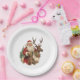 Platos de papel con un ilustracion de Navidades divertidos. Santa Claus con su tradicional traje rojo montado en un gran reno encorvado decorado con un hueco. Un árbol de Navidad en la parte de atrás.