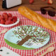 Creativo fiesta de reunión familiar y platos de picnic con un árbol lleno de coloridos pájaros divertidos. Para personalizar el texto de edición para agregar nombre o personalizar de otro tipo.
