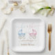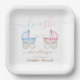 Dos coches de bebé aparecen en estos adorables Plates de Fiesta Reveladores de sexo ¿Qué será el bebé? Los cochecitos rosas y azules de estilo vintage ocupan el centro del escenario en los platos fiestas. Elegante tipo de letra de guión en rosa y azul. Personaliza con tus nombres.