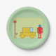 Un robot de aspecto retro parado al lado de un auto amarillo. Este diseño se ve realmente efectivo en estas placas de papel