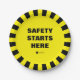 Placas de papel de seguridad en el lugar de trabajo amarillas y negras con "Safety Starts Here" y su logotipo. Personalizable completo. Puede cambiar el texto, poner el logotipo de su empresa o eliminarlo. ¡Seguridad primero!