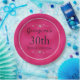 Estos platos de fiesta personalizados presentan un diseño glamuroso. Un borde brillante de purpurina rosa falsa enmarca el plato. El fondo es un diseño de lámina rosa caliente brillante. Un nombre de muestra y una fecha de cumpleaños se imprimen en el centro, que se puede personalizar para incluir su propio nombre personalizado, título del evento u otro texto. Diamantes acentúan las partes superior e inferior del área de texto. Es perfecto para un cumpleaños, una despedida de soltera u otro evento especial.