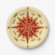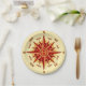 Una simple imagen gráfica de un rosa de brújula vintage que muestra los 16 puntos de la brújula en tonos rojos con letras marrones sobre un fondo de color oro y crema.