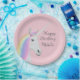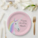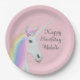 Las placas de papel rosadas personalizadas de la fiesta de cumpleaños del unicornio tienen un unicornio lindo grande con el pelo del color en colores pastel en sombras de rosado, de púrpura, la turquesa, el amarillo, el azul y el melocotón. El "feliz cumpleaños" y el nombre personalizado está también por el unicornio. El fondo es rosa en colores pastel. También vea los productos a juego con este diseño aquí en esta misma tienda: JennLenayDesigns.