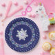 Copo de nieve con mi dibujo de una vidriera de una antigua iglesia europea: una ventana rosa, con toques de una gran variedad de colores, incluyendo tonos azules, sobre un fondo azul marino. Entrada de diamantes de imitación azul claro (dibujado). Para un viejo patrón de invierno. Este motivo también está disponible en rojo cardinal en mis colecciones de "rosácea roja cardinal".