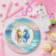 Platos de papel playeros elegantes de caballitos de mar en acuarela rosa, azul y dorado. Son lindos para regalos de boda o una barra de dulces.