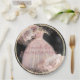 Este encantador plato fiesta personalizado presenta una temática de quinceañera rosa y dorada. En el centro, sobre un fondo negro, se coloca un vestido de bata de bola glamuroso. Una tiara de Relieve metalizado de imitación dorada está encima del vestido, con un marco dorado a juego. Las ramas de rosas de color acentúan las esquinas, y el purpurina rosa se esparce por las partes superior e inferior.