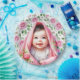 Cute chica con placas de papel para bebés. Bebé adorable con pelo negro y ojos azules sonriendo bajo una manta rosa de palomitas. Un fondo de rosas rosas rosas y follaje verde.
