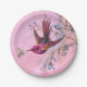 Un colibrí rosado fluye por el lecho de flores en busca de una mariposa verde. El suave y delicado fondo crea una oscurecida sugerencia de flores y cielo. Los colores del colibrí, el magenta, el rosa y el rosa, fueron alterados y brillantes para crear esta declaración de estilo femenino para la decoración, accesorios y correspondencia.