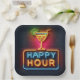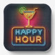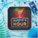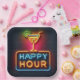 Luces de neón brillantes muestran el mensaje "Happy Hour" y un cóctel gráfico en un fondo de pared de ladrillo