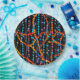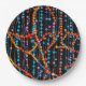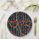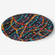 An abstract design of colorful beaded strings covers this round paper plate.