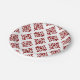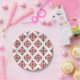 Round plate with a white background, featuring a repetitive red ornamental pattern. The design resembles symmetrical, abstract flourishes. The tone is elegant and classic.