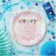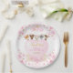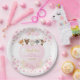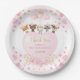 Este adorable plato de papel incluye confetti de corazones rosados y dorados, flores de color de agua rubia y bonitos animales de bosque