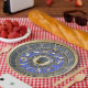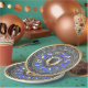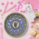 Conjunto de ocho placas de papel de 9" con una imagen de una rueda zodiaca azul y dorada. Vea la combinación de tarro de caramelo, taza, azulejos de cerámica cuadrada y tiras acuáticas. Vea toda la colección Gemstones & Medallions Plate en la sección HOME.