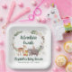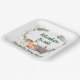 Rústico plato de papel para bebé de invierno con un lindo ilustracion acuarela de animales de bosque de bebés, flores, vegetación y estrellas doradas y copos de nieve. "Adventure Awaits" y el nombre de la futura madre están escritos en un guión verde oscuro del bosque.