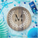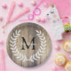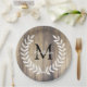 Madera de granero rústica y rústica marrón claro con fondo de tablones con silueta de laureles blancos enmarcando tu elección de letra monograma en negro y apellido completo en escritura blanca. ¡Estos platos son excelentes para los bodas! ¡Echa un vistazo a las servilletas de papel!