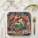 Una fotografía de estilo clásico de una mujer impresionante con un vestido blanco corto y elegante, haciendo una pose seductora junto a un lujoso automóvil deportivo convertible rojo.
