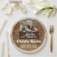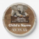 Personalized adventure first birthday paper plates featuring safari elephant, vintage old world map background, and rustic wood sign design with child’s name and birth date create a memorable explorer-themed celebration.