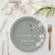 Estos modernos platos de papel de boda de jardín floral de chinoiserie verde sabio se pueden personalizar con su información en una tipografía elegante. Diseñado por Thisisnotme©