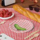 Placa de papel con la hormiga que lleva una salmuera. Parte de la colección de la comida campestre del verano.