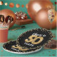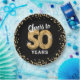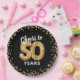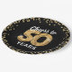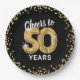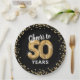 Elegantes platos de papel para fiestas de 50 años con un elegante fondo negro que se puede cambiar a cualquier color, purpurina brillante de oro, y el dicho "vítores a 50 años" usando cincuenta globos de helio de oro.