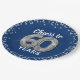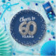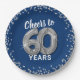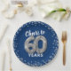 Elegantes platos de papel para fiestas de 60 años con un fondo azul de moda que se puede cambiar a cualquier color, purpurina brillante de plata, y el dicho "vítores a 60 años" usando sesenta globos de hellio de plata.