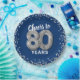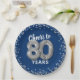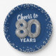 Elegantes platos de papel para fiestas de ochenta años con un fondo azul de moda que se puede cambiar a cualquier color, purpurina brillante de plata, y el dicho "vítores a 80 años" usando ochenta globos de hellio de plata.