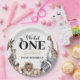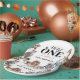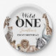 Platos de papel fiesta salvajes de un solo cumpleaños con animales de safari adorables con acuarela (jirafa, elefante, león, cebra, leopardo, mono, pájaro que come abejas), y una plantilla de celebración fácil de personalizar.