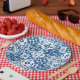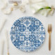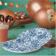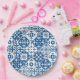 Platos de papel para ducha de novia Dancing Queen de inspiración mediterránea griega con baldosas azules.