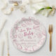 Sea you soon seashells beach girls baby shower monogrammed paper plates. Pink preppy seashells baby shower personalized paper plates, beach baby shower party plates, summer baby shower custom party plates, hand drawn doodle sketch seashells baby shower personalized table decor, hand writing vintage baby shower paper plates