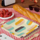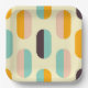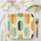 A seamless geometric pattern features vertical, oval shapes in soft yellow, teal, peach, orange, and brown, creating a retro, playful vibe.