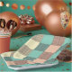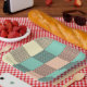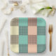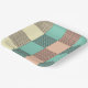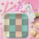 A seamless plaid pattern with alternating pastel squares in turquoise, cream, and beige. Each square is filled with a crisscross grid design, creating a vintage and orderly feel.