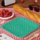 Seamless pattern of small, evenly spaced white polka dots on a solid teal or emerald green background.