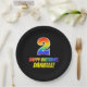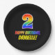 Este divertido, colorido y alegre diseño de placa de papel con temática de cumpleaños presenta un gran número "2" y el mensaje "FELIZ CUMPLEAÑOS", ambos coloreados con un patrón inspirado en el gradiente del espectro del arcoiris, junto con un nombre en negrita de personalizable amarillo. Tiene un fondo de color negro. Platos de papel divertidos y editables como este podrían ser usados en una fiesta de cumpleaños que se lleva a cabo para celebrar el segundo cumpleaños de alguien. [~Z0000488]