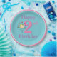 Grande rosa y morado número dos. Un lindo chica personalizado con el pelo amarillo y un vestido azul parado a la izquierda del número. Arriba y debajo del número están las palabras Feliz Cumpleaños. El fondo es azul con pequeños puntos de polka y un marco blanco y rosa.