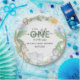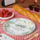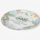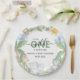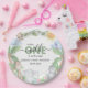 Platos de papel para baby shower con ilustraciones de acuarela de un mono, loro, rinoceronte y jirafa sentados en un fondo de jungla verde. Los estilos de fuente, tamaño y color se pueden cambiar haciendo clic en el enlace personalizar más después de personalizar.