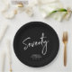 Este plato de papel personalizado le añadirá un detalle elegante a su día especial. Este diseño presenta un sencillo guión de pincel de moda "Setenta" con texto personalizado. En mi tienda BaraBomDesign hay disponibles invitaciones para cumplir 70 años y suministros para fiestas.