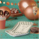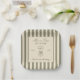 Birthday paper plate featuring a hand-drawn coffee martini glass and coffee beans paired with elegant script and serif fonts in which your personalized information is written. The background is brown stripes on a light background. Check out our store for more items from this collection.