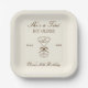 Birthday paper plate featuring a hand-drawn coffee martini glass and coffee beans paired with elegant script and serif fonts in which your personalized information is written. The background is brown stripes on a light background. Check out our store for more items from this collection.