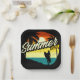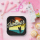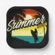 Diseño de estilo retro con "vibraciones de verano" texto con atardecer tropical y silueta de surfista femenina