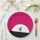 Platos de papel con un tipo zombie genial. Combinación de colores vivos rosa y negro en negrita. Una silueta zombie con brazos extendidos en la caza de cerebros. Una gran luna blanca se ilumina por detrás.