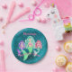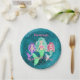 Placas personalizadas de papel de sirena con tres sirenas con largos cabellos color púrpura, verde azulado y rosa caliente en un fondo de decoración verde azulada de sirena. Con la opción de mantener o borrar el texto "Bendita" "Mermaid Sarah" en rosa. Diseño © por Nayda Liz Rivera
