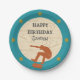 Crear placas fiestas personalizados con un tema de patinaje. Estas placas de papel de patinaje cuentan con un ilustracion de un patinador en un naranja de roya montado sobre un falso fondo de madera. El texto está en gris carbón y todo está listo para ser personalizado con su información.