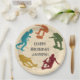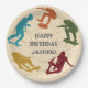 Crear suministros de fiesta personalizado con un tema de skateboarding. Estos platos de papel para el parque de patinaje cuentan con ilustraciones de patinadores en naranja de óxido, azul turquesa, rojo oscuro, amarillo mostaza y verde sobre un fondo falso de madera. El texto está en gris carbón y todo está listo para ser personalizado con su información.