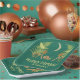 Mis ilustraciones representan un mundo natural con algunos tonos oscuros. Una luna creciente cuelga en el cielo sobre una escena de helechos verdes, polillas amarillas, setas marrones y un caracol verde y marrón, todo ello con un fondo de color verde azulado oscuro. Estas placas de papel están listas para ser personalizadas con tu propio mensaje en letras amarillas pálidas.