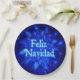 Un enjambre de copos de nieve fractales azules. El texto en español que dice "Feliz Navidad" aparece en azul y blanco brillante.