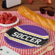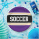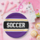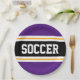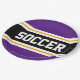Este diseño deportivo y atlético presenta texto en negrita de SOCCER dentro de una franja negra de centro ancha realzada con pinstripes blancas y amarillas contra rayas reales exteriores púrpura. El texto se puede personalizar.