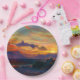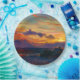 Un diseño artístico de una hermosa puesta de sol también muestra rocas, playa y un hombre pescando.