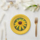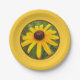 Estas placas de papel están diseñadas con mi opacidad disminuida fotografía de primer plano de una flor de Rudbeckia (Susan de Ojos Negros) amarillo brillante sobre un fondo de vegetación de jardín en el centro. El diámetro de la foto está enmarcado por un delgado borde marrón sobre un amplio borde de placa recortado amarillo.